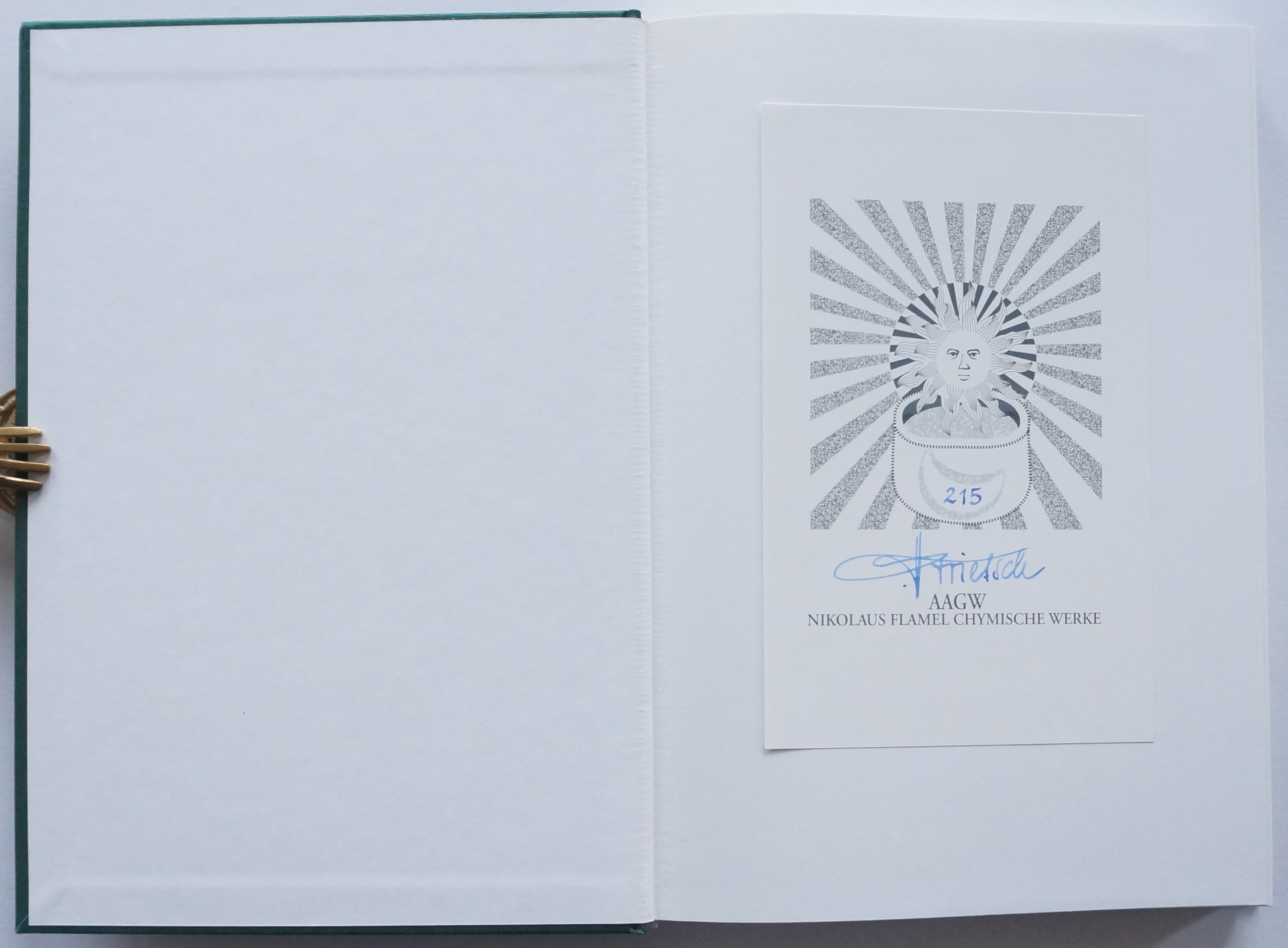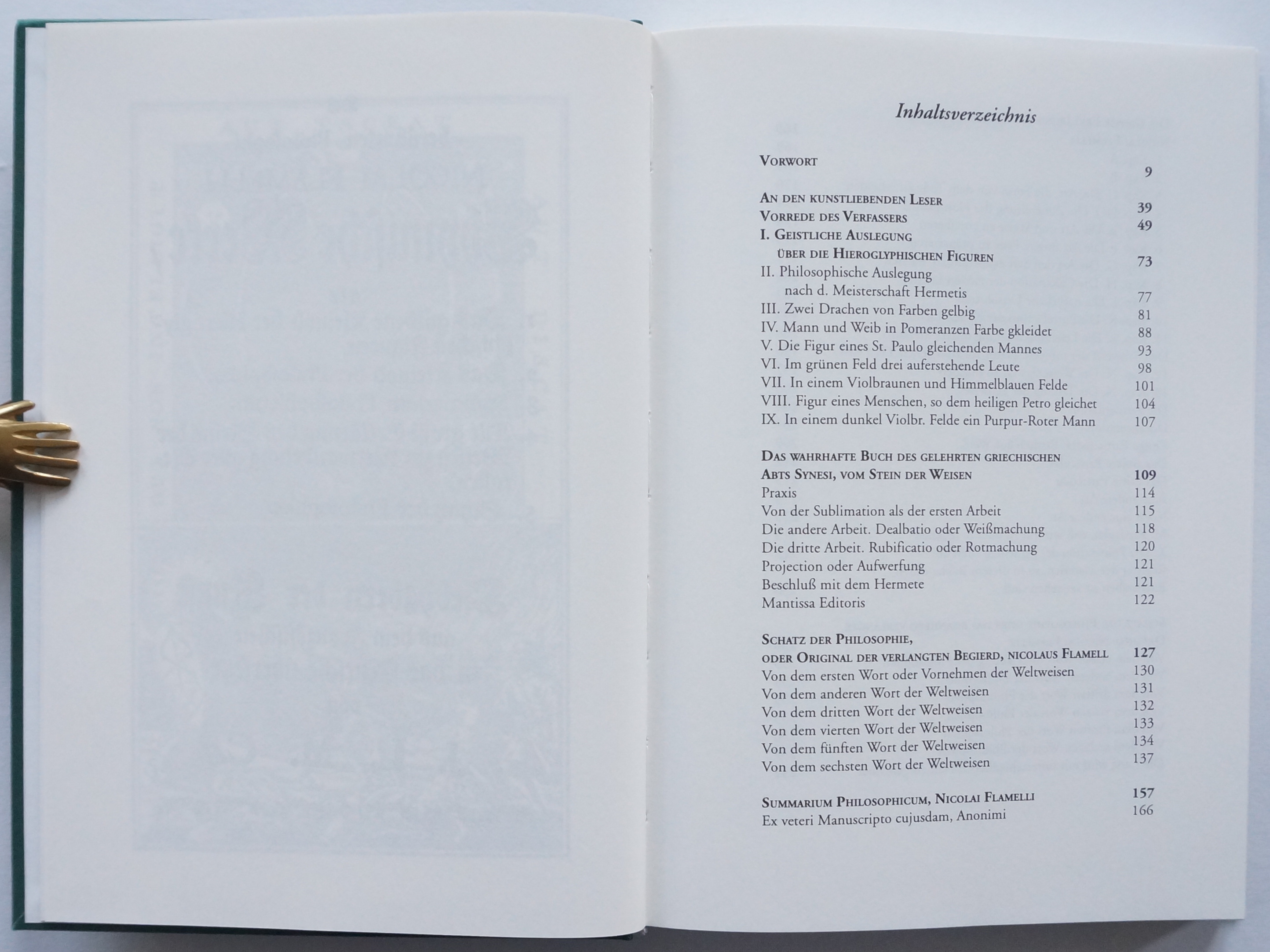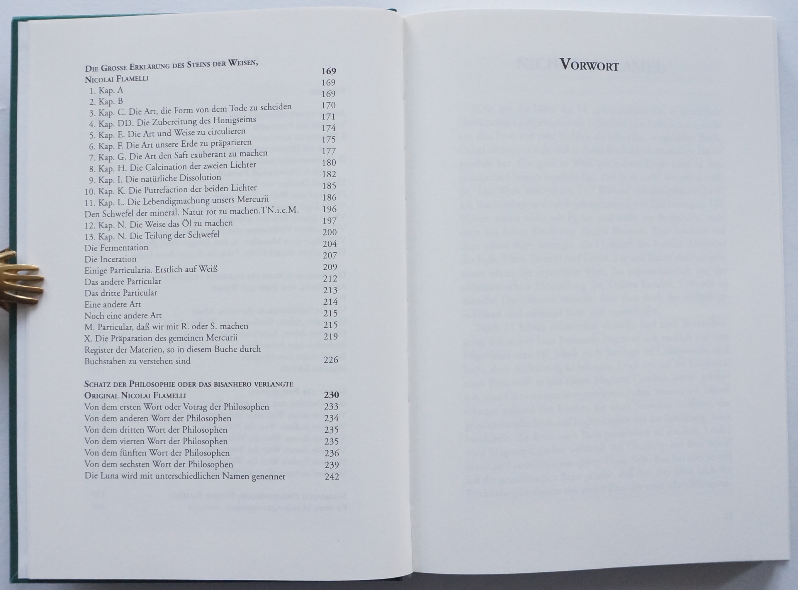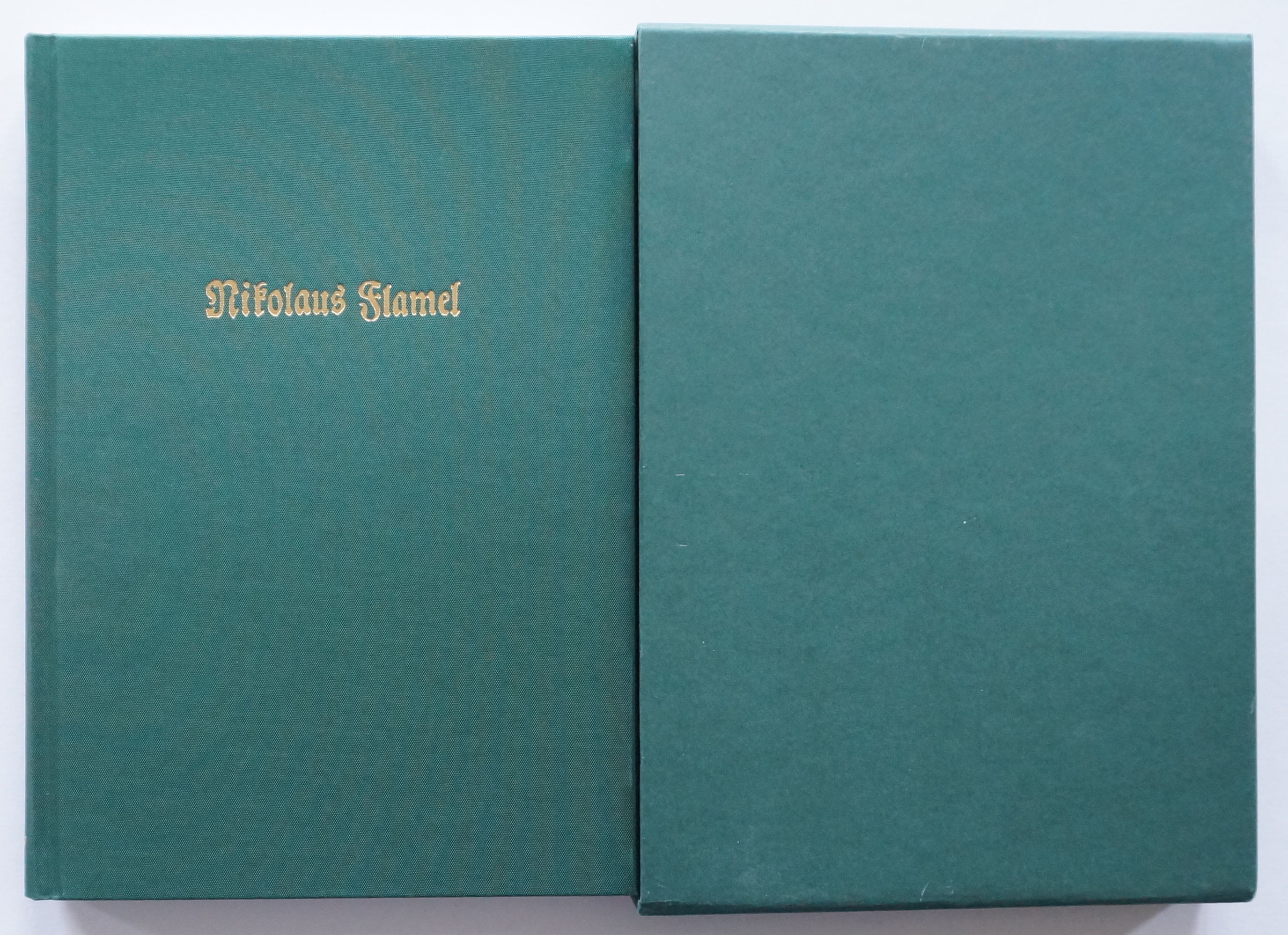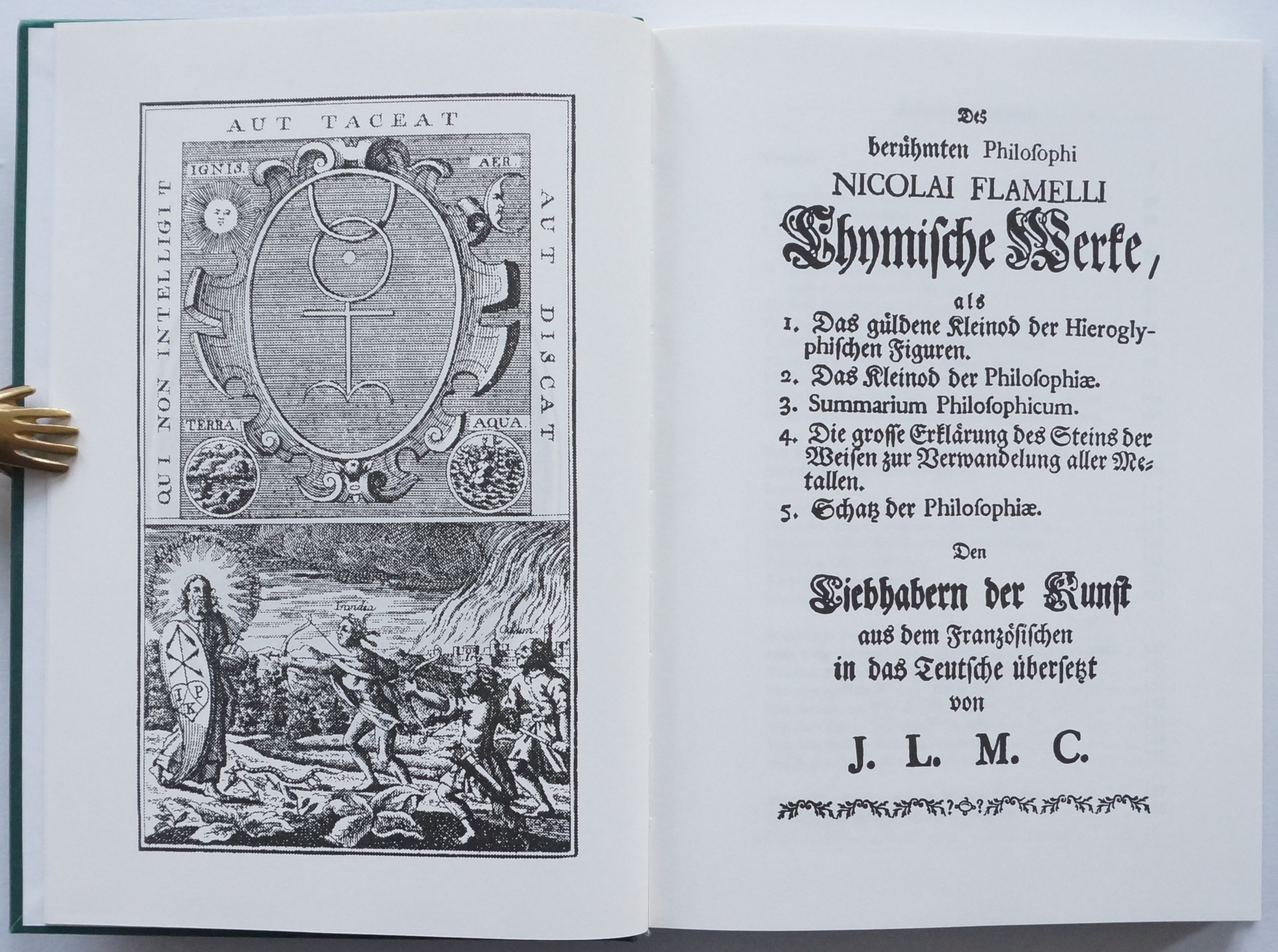 Chymische Schriften. (Mit einem Vorwort von Dr. Hans Thomas Hakl). Sinzheim, AAGW Archiv für Altes und Geheimes Wissen, H. Frietsch-Verlag 1996. Mit 1 Porträt und 10 Abbildungen auf 5 Tafeln im Text. 259, [1] w. S., 4 Bl. Verlagsanzeigen. Dazu als lose Beilage nochmals die Abbildungen des Werkes „für eine mögliche Colorierung“: „Die berühmten Abbildungen des Nikolaus Flamel“. 3 gefaltete Doppelblätter mit 5 Tafeln. Grüner OLeinwand-Band mit goldgeprägtem Rücken- und Deckeltitel in grünem OPapp-Schuber.