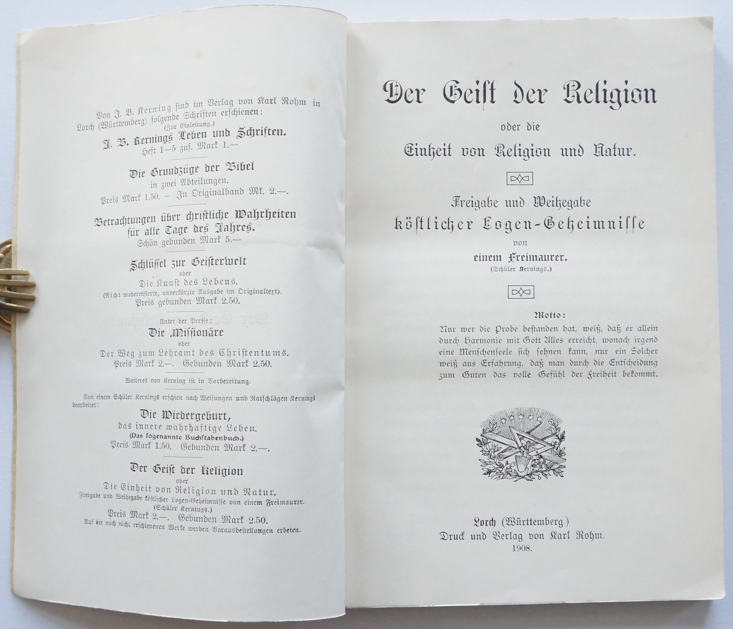 Der Geist der Religion oder die Einheit von Religion und Natur. Freigabe und Weihegabe köstlicher Logen-Geheimnisse von einem Freimaurer. (Schüler Kernings.) Lorch (Württemberg), Druck und Verlag von Karl Rohm 1908. 224 S. Schlichte neue Broschur.