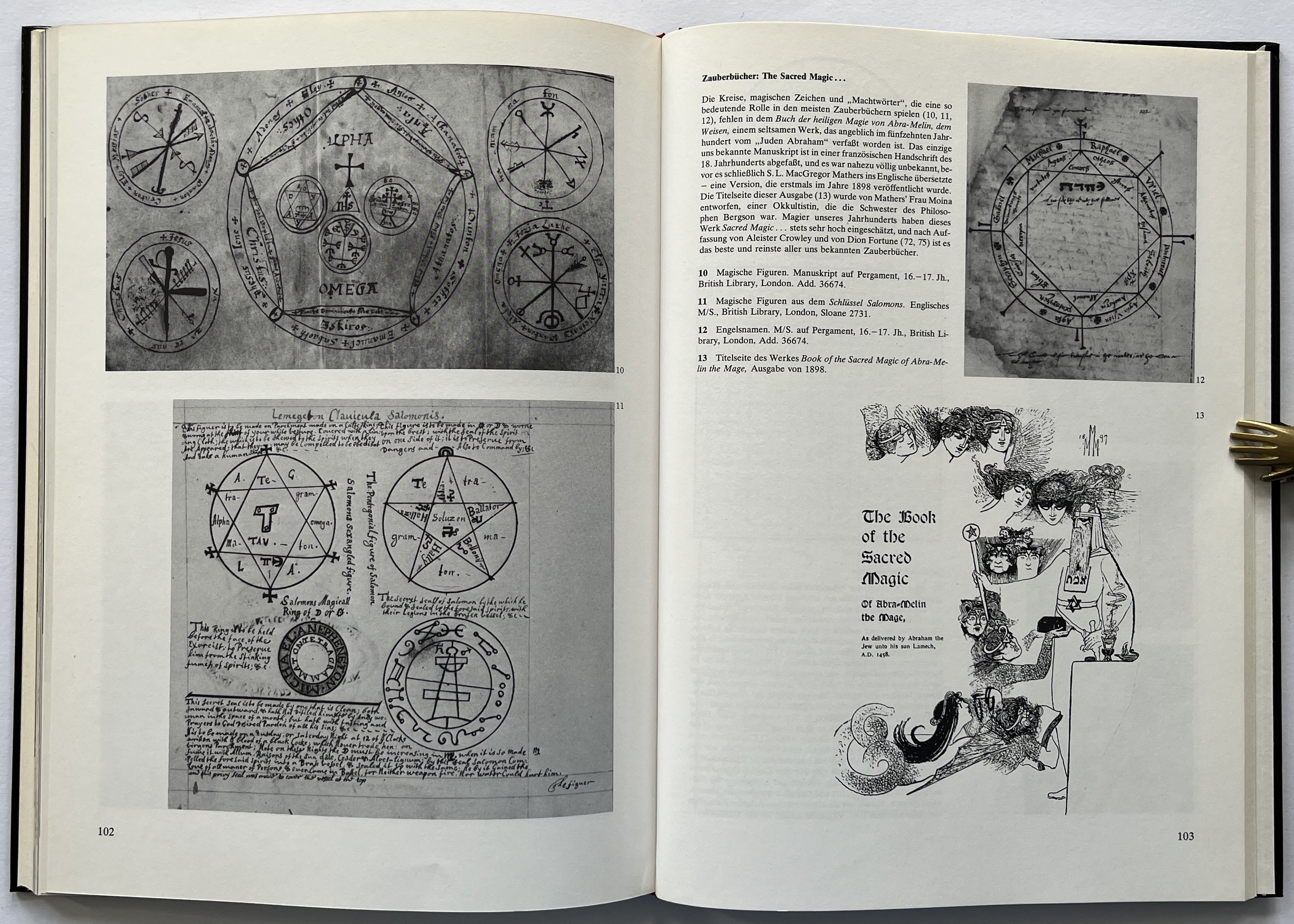Magie. Eine Bilddokumentation. Aus dem Englischen [übersetzt] von Wolfram Wagmuth. Frankfurt am Main, Umschau Verlag 1976. 4°. Mit 150, teilweise farbigen Abbildungen. 128 S. Farbig illustrierter OPapp-Band.