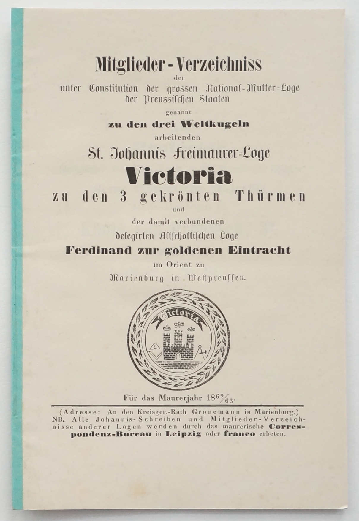 Mitglieder-Verzeichniss der unter Constitution der grossen National-Mutter-Loge der Preussischen Staaten genannt zu den drei Weltkugeln arbeitenden St. Johannis Freimaurer-Loge Victoria zu den drei gekrönten Thürmen und der damit verbundenen delegirten Altschottischen Loge Ferdinand zur goldenen Eintracht im Orient zu Marienburg in Westpreussen. Für das Maurerjahr 1862/63. Marienburg, gedruckt beim Br. M[oritz] Kanter [1862]. 15, [1] w. S. Geheftet.
