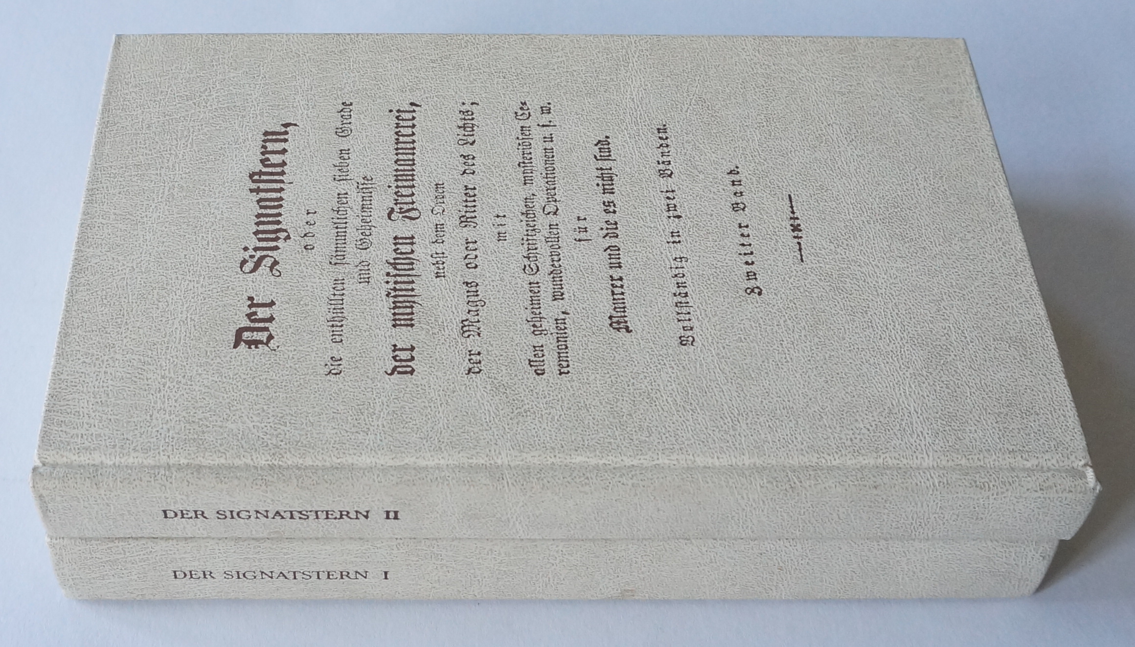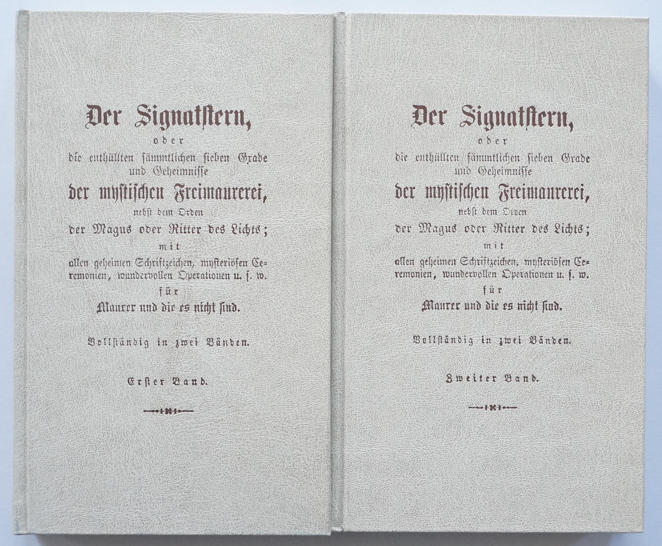Signatstern, Der, oder die enthüllten sämmtlichen sieben Grade und Geheimnisse der mystischen Freimaurerei, nebst dem Orden der Magus oder Ritter des Lichts; mit allen geheimen Schriftzeichen, mysteriösen Ceremonien, wundervollen Operationen u. s. w. [für Maurer und die es nicht sind. Vollständig in zwei Bänden. Dritte durchgesehene Auflage mit vielen Abbildungen. Stuttgart, J. Scheible 1866]. Mit einer Einführung von Fritz Bolle. 2 Bände. Freiburg, Aurum Verlag 1979. Mit 3 Textfiguren und 5 Tafeln. XII, 352, [4] S. [= 1 Tafel und 3 S. Verlags-Anzeigen]; [4], 316 S., [4] S. [= 4 Tafeln]. OKunst-Leder-Bände.