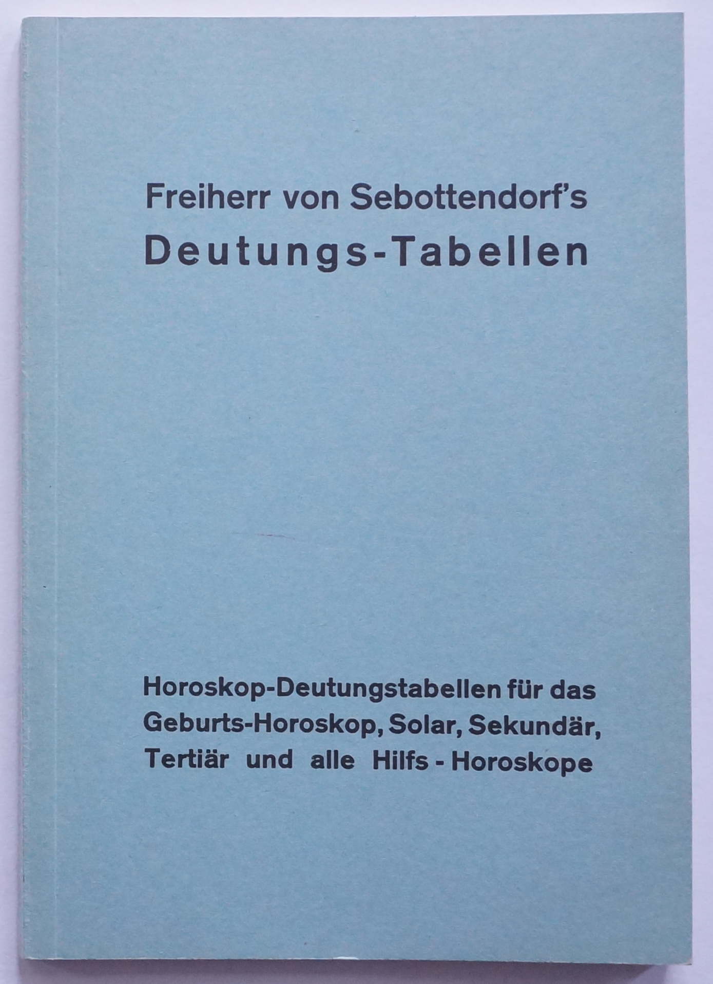Deutungs-Tabellen. Horoskop-Deutungstabellen für das Geburts-Horoskop, Solar, Sekundär, Tertiär und alle Hilfs-Horoskope. Warpke-Billerbeck (Hann.), Baumgartner-Verlag [ohne Jahr]. 100 S. OKartonage mit Rückentitel.