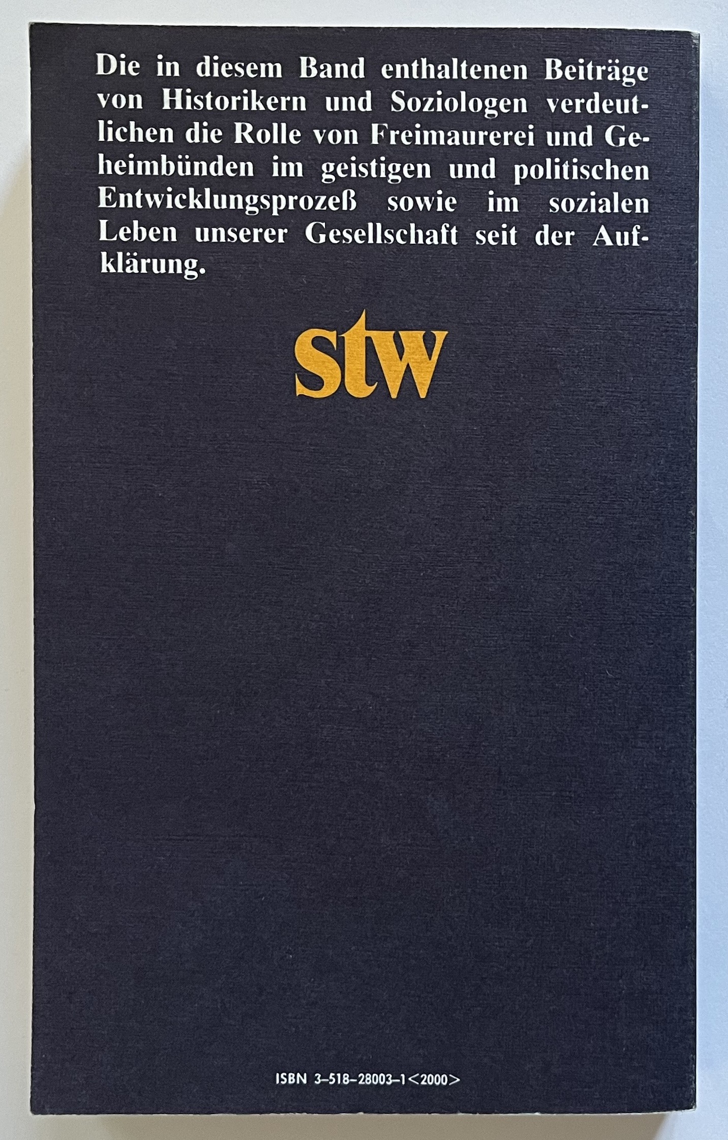 Freimaurer und Geheimbünde im 18. Jahrhundert in Mitteleuropa. Frankfurt am Main, Suhrkamp Verlag 1983. 1. Auflage. Kl.-8°. 403, [1] S., 2 Bl. Verlagsanzeigen. OKartonage.