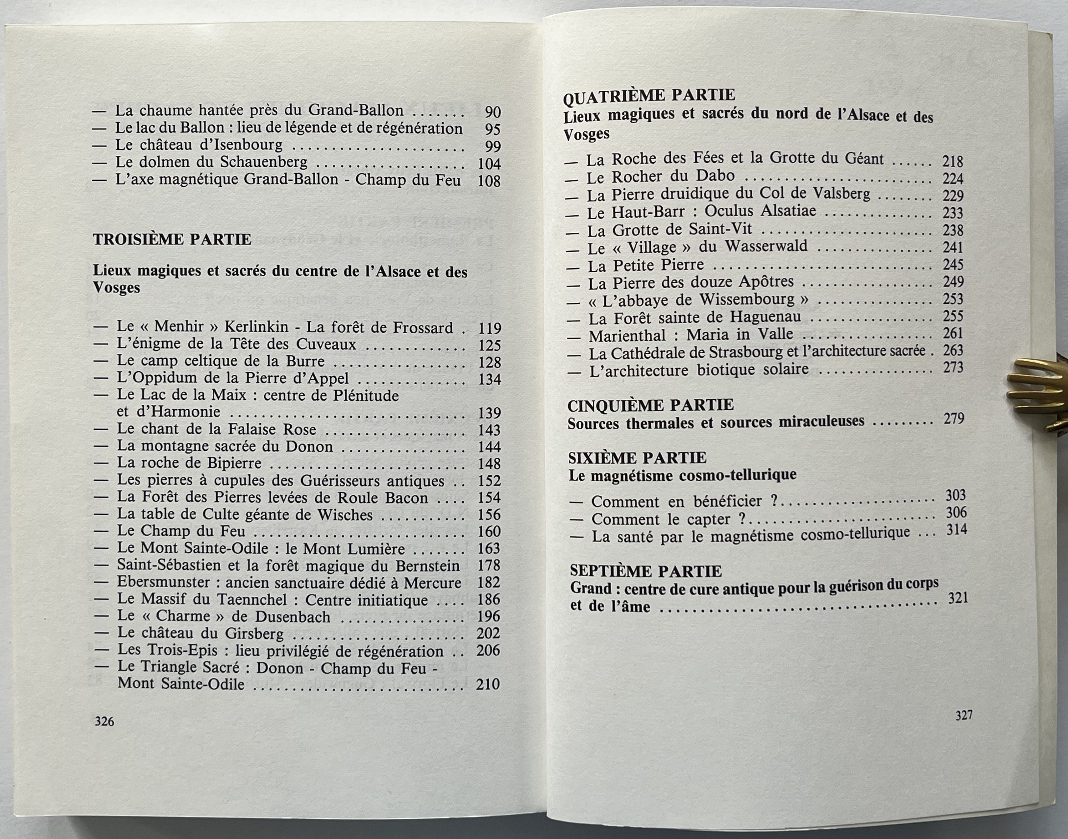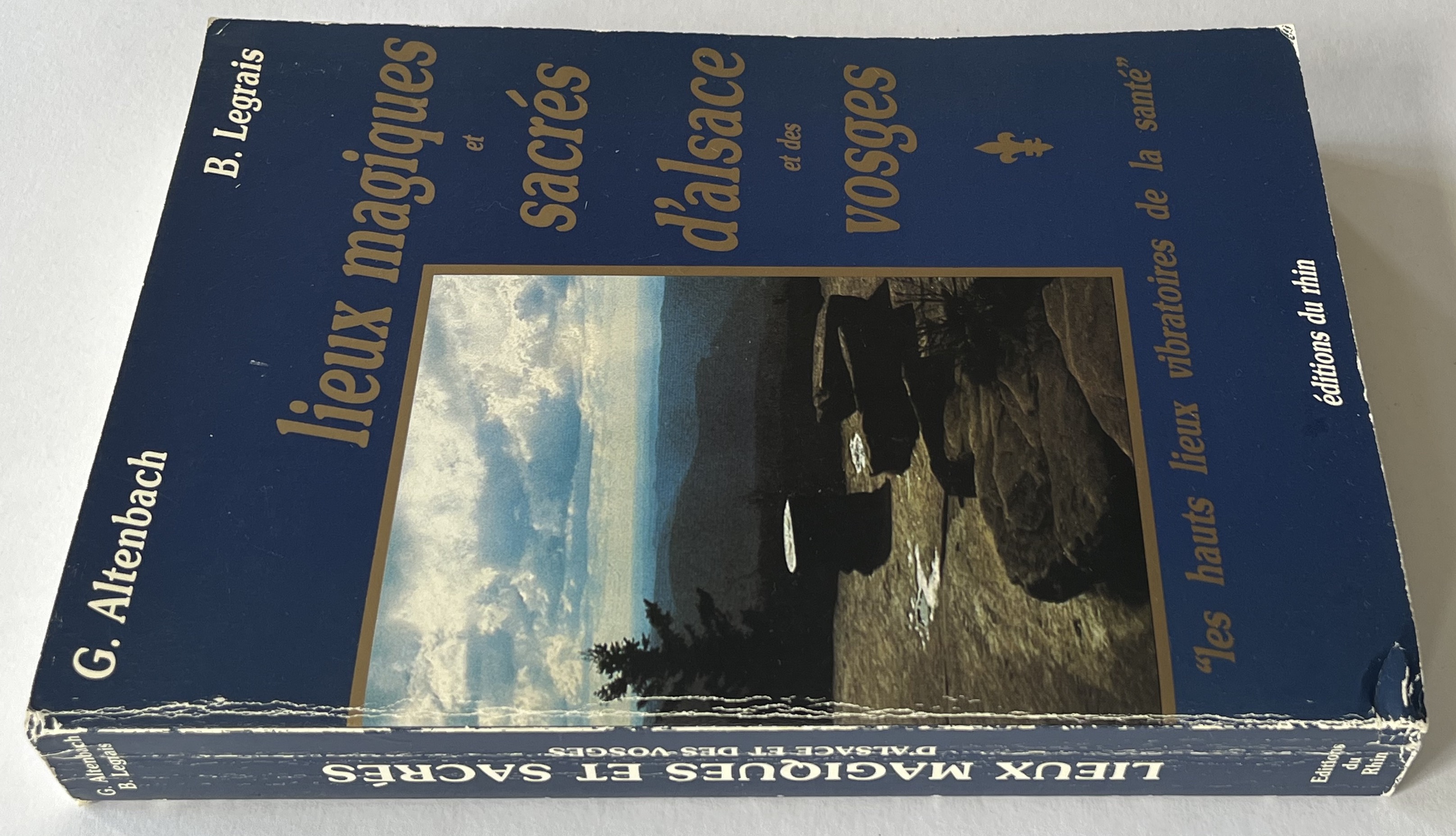 Lieux magiques et sacrés d’Alsace et des Vosges. Les Hauts Lieux vibratoires de la Santé. Steinbrunn-le-Haut, Édtions du Rhin 1983. Avec nombreux illustrations dans le texte et 4 planches en couleurs. 327, [1] S. Farbig illustrierte OKartonage.