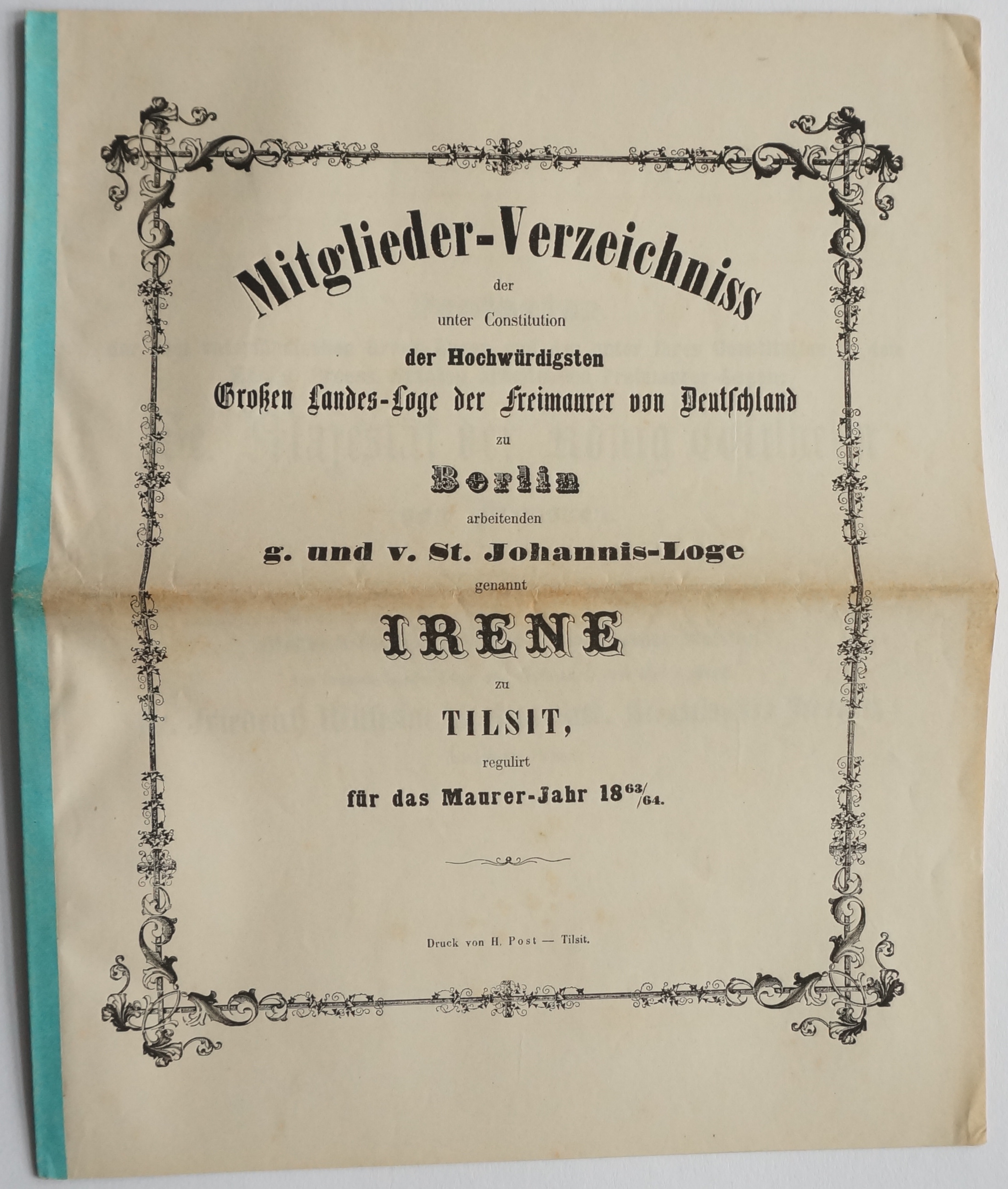 Mitglieder-Verzeichniss der unter Constitution der Hochwürdigsten Großen Landes-Loge der Freimaurer von Deutschland zu Berlin arbeitenden g. und v. St. Johannis-Loge genannt Irene zu Tilsit, regulirt für das Maurer-Jahr 1863/64. Tilsit, Druck von H. Post [1863]. 4°. [275 x 225 mm]. 12 S. Geheftet.