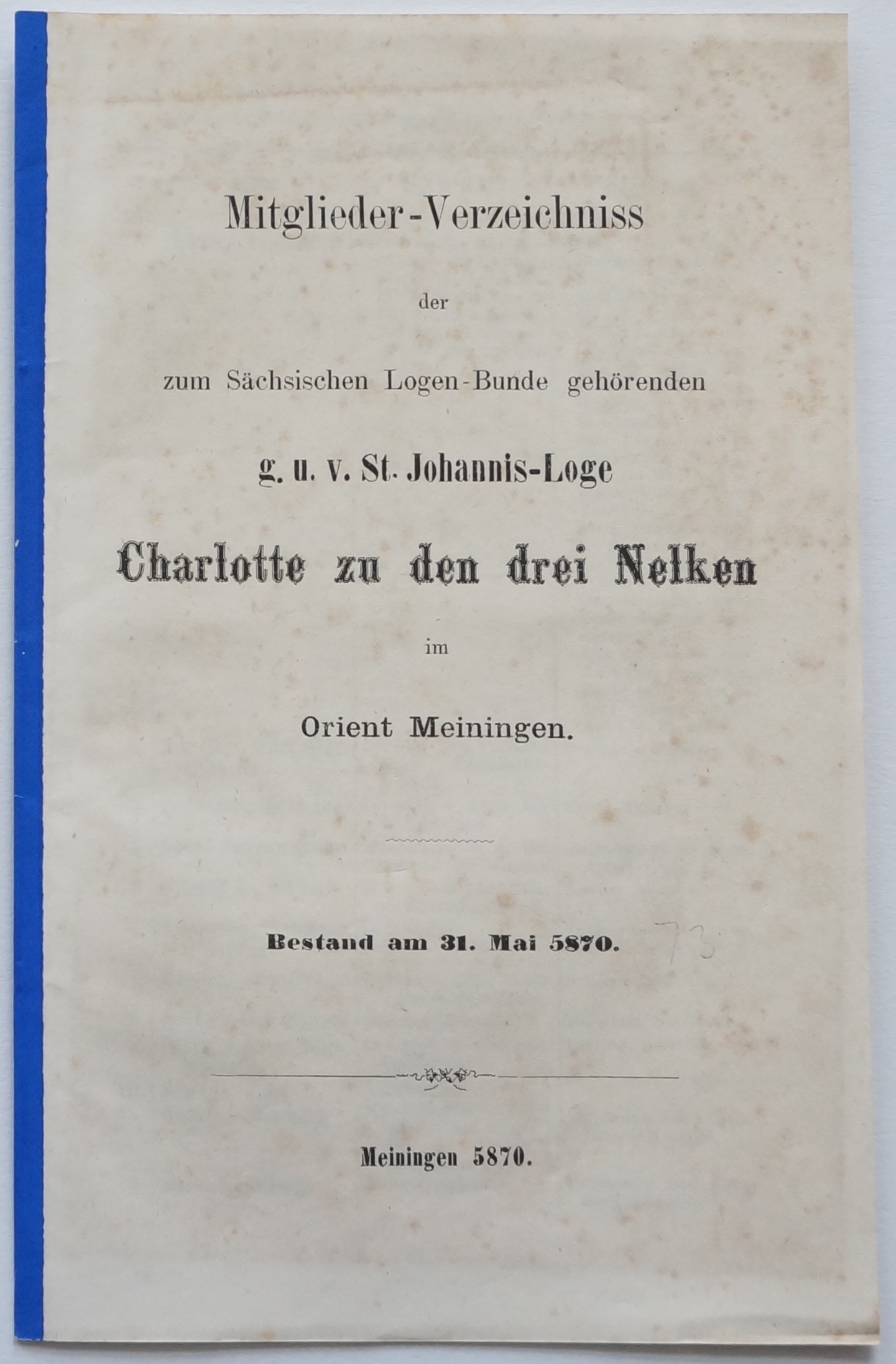 Mitglieder-Verzeichniss der zum Sächsischen Logen-Bunde gehörenden g. u. v. St. Johannis-Loge Charlotte zu den drei Nelken im Orient Meiningen. Bestand am 31. Mai 5870 [1870]. Meiningen [ohne Drucker] 5870 [1870]. [16] S. Geheftet.