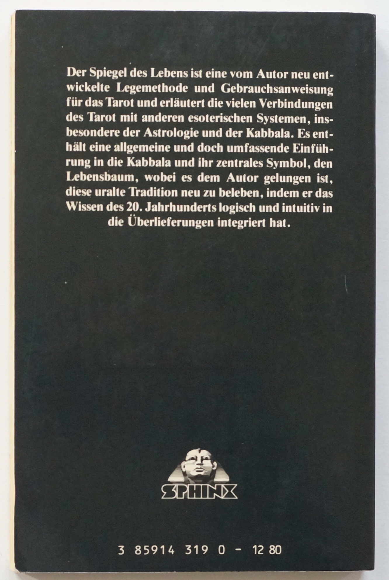 Spiegel des Lebens. Tarot und Kabbala. Basel, Sphinx Verlag 1985. 2. Auflage. Kl.-8°. Mit zahlreichen Textfiguren. 125, [1] w., [1] Verlagsanzeige, [1] w. S. Farbig illustrierte OKartonage.