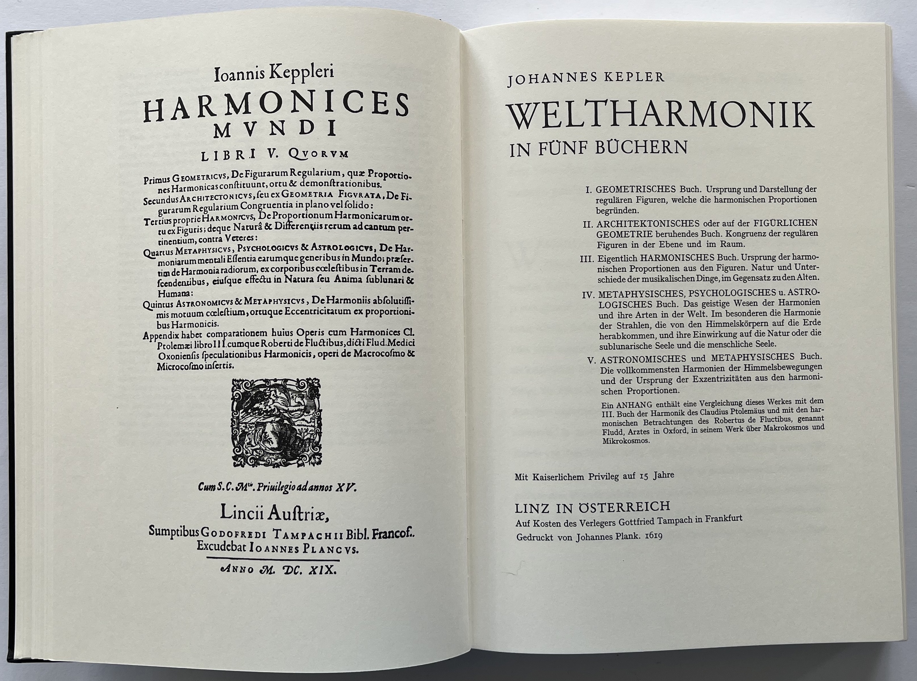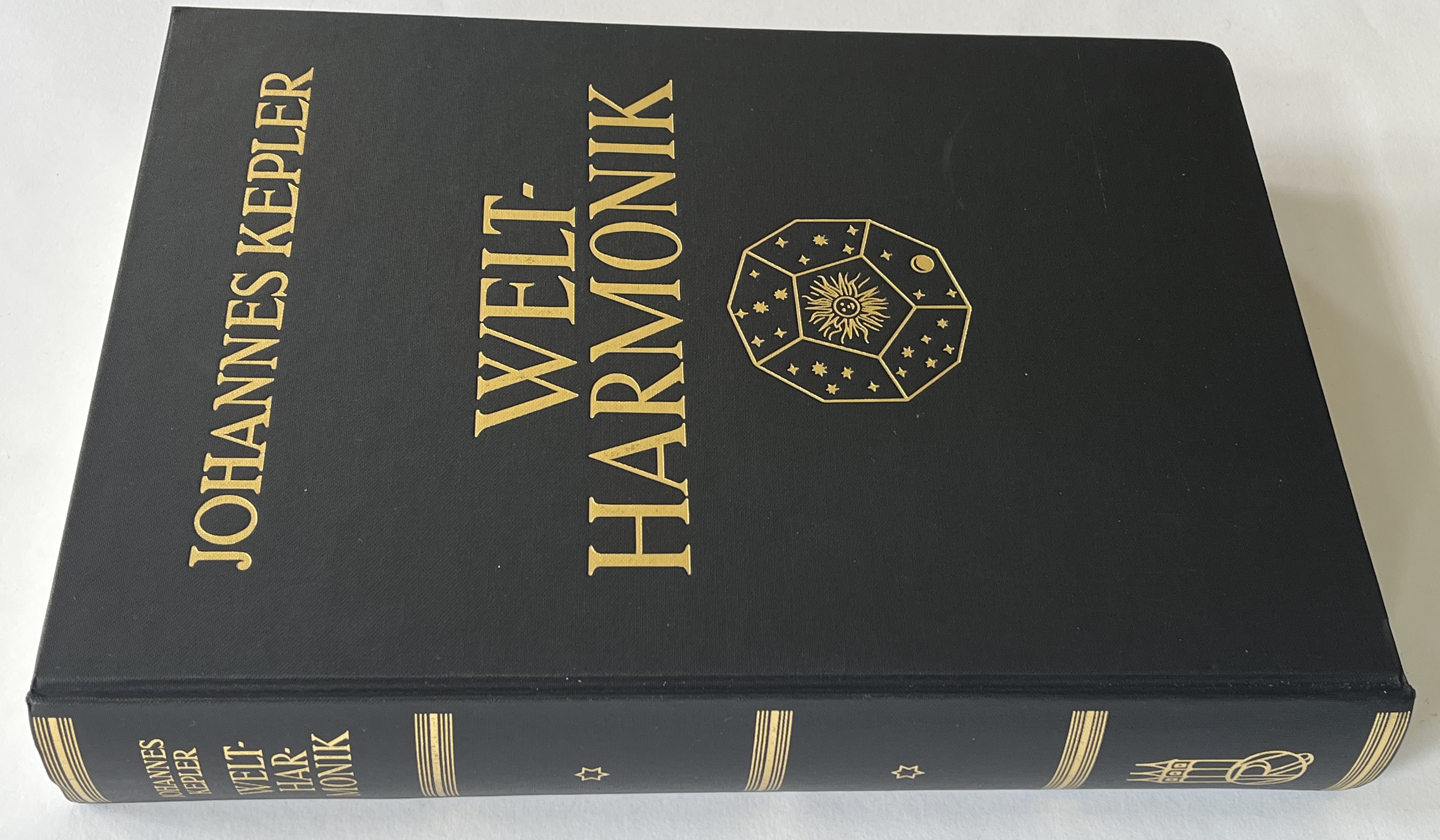 Weltharmonik. Übersetzt und eingeleitet von Max Caspar. München, R. Oldenbourg Verlag 2006. Sechster, unveränderter reprographischer Nachdruck der Ausgabe von 1939. 4°. Mit zahlreichen geometrischen Figuren und Notenbeispielen im Text. 56, 403, [1] w. S. Schwarzer OLeinwand-Band mit goldgeprägtem Rücken- und Deckeltitel, Rückenvergoldung und Deckelgoldprägung, farbiger Kopfschnitt.